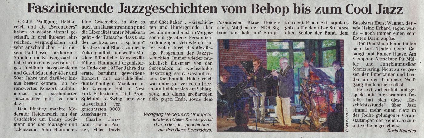 Routiniert, aber voller Elan gelang es den Musikern, die Geschichte des Jazz in Ausschnitten aufleben zu lassen und einen herrlichen Rahmen zu schaffen für die Erzählungen von Wolfgang Heidenreich. In seinen Textbeiträgen brachte er den interessierten Zuhörern Ausschnitte der Jazzgeschichte von den 30er bis in die 80er Jahre näher - ausgerichtet an den Biographien von John Hammond und Benny Goodman,