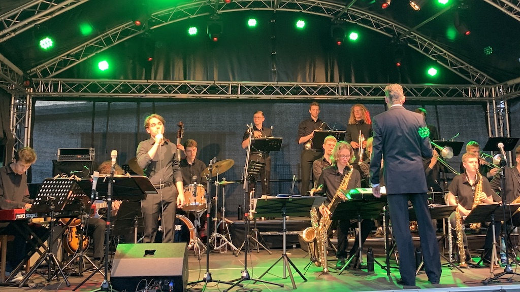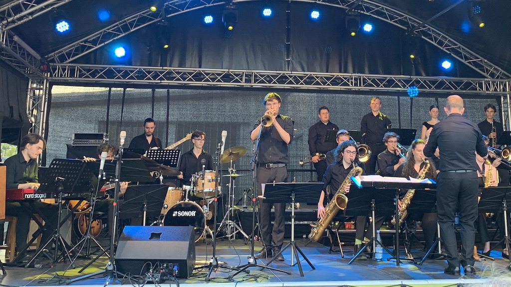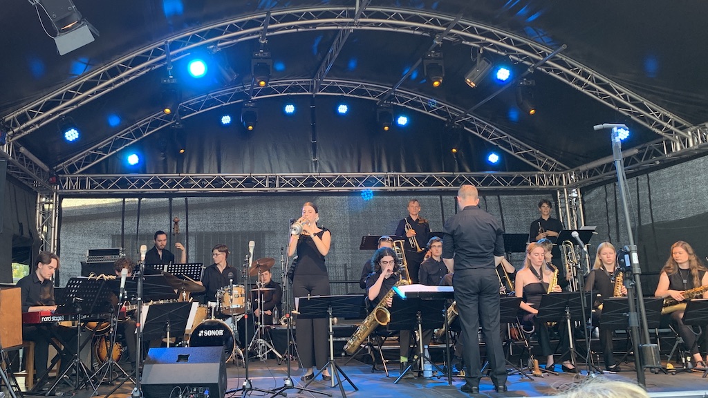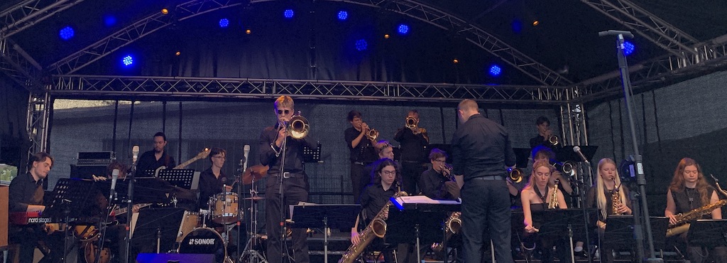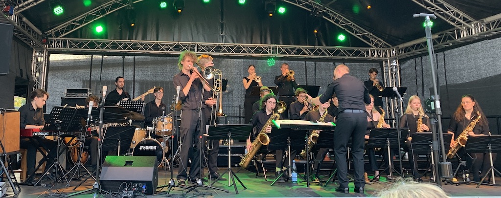 Die Bandbreite des Repertoires reichte von einer Komposition des Deutschen Peter Herbolzheimer bis hin zu einem gesungenen Song des legendären US-Amerikaners Frank Sinatra. Ausdrucksstark präsentierten sich alle Ensemblemitglieder – ob im Solo oder eingebunden in den orchestralen Klangkörper. Das Jazzpublikum vor der Bühne honorierte die Leistung mit Zwischenapplaus sowie mit kräftigem Beifall am Ende der jeweiligen Passagen. Fazit: Top-Leistung und Top-Stimmung im Innenhof.