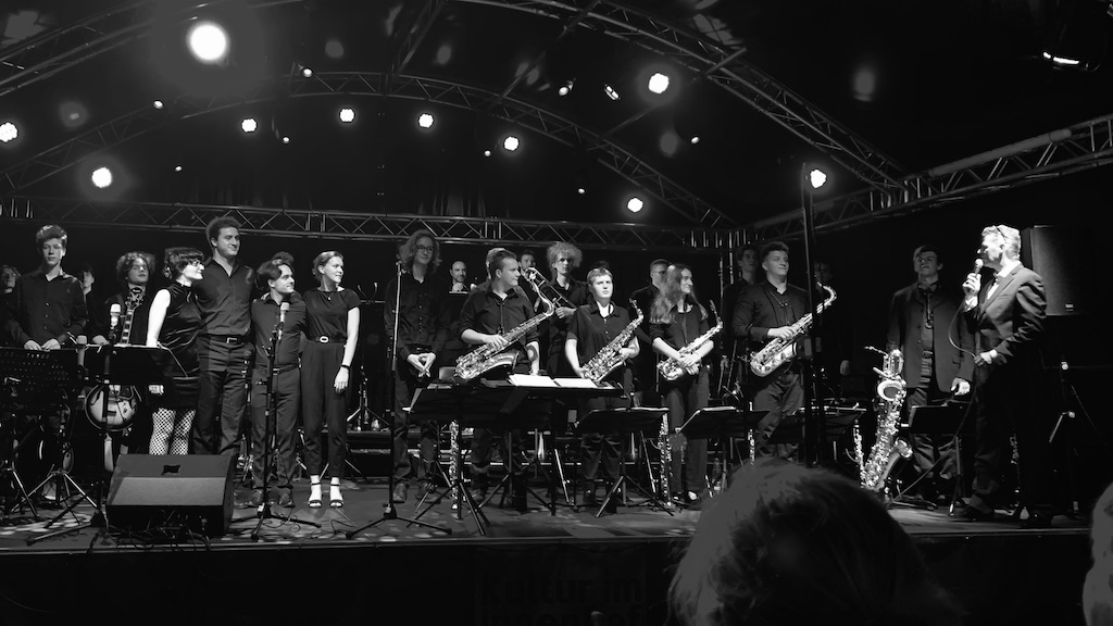 Den Hauptact des Abends lieferten landesweit ausgewählte „Nachwuchs-Cracks“ im Alter zwischen 15 und 22 Jahren mit Saxophonen, Trompeten, Posaunen, Piano und Stimme(n). Sie trafen auf ein – durch die Auftaktband – emotional animiertes Publikum. Es war ein Auditorium, das staunte, genoss und mitging. Johannes Klose vom Landesmusikrat sprach mit Blick auf die Gruppe, halb scherzend, halb ernsthaft, von „handverlesenen Musikerinnen und Musikern“. Sie hatten sich bei Workshops für das Ensemble qualifiziert und anschließend mit den Dirigenten Erik van Lier und Uli Plettendorf intensiv geprobt.