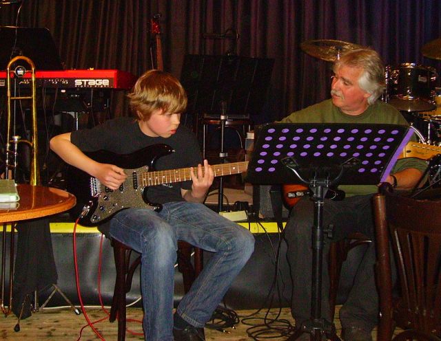 Sowohl Eigenkompositionen des Hamburgers Sigi Dresen (Bluesible) und Stefan Golinskis (You know what) fanden hier Platz wie auch die Interpretationen bekannter Jazzer wie Dizzie Gillespie (Anthropology), Herbie Hancock oder Thelonious Monk, letztere beiden sehr ansprechend vertreten durch zwei Schüler: Julius Wellmann mit Blue Monk als Gitarrenduett, was ihm viel Beifall und anerkennendes Schulterklopfen seitens des begleitenden Lehrers Uli Wißmann einbrachte; wie auch Paul Tollemer schon sehr sicher und selbstbewusst mit der ganzen Mannschaft im Rücken kommunizierte und mit Cantaloupe Island die Beherrschung komplizierter Gitarrenlinien unter Beweis stellte. Da war Schwung und Pep drin und das Publikum reagierte darauf auch begeistert und spontan.