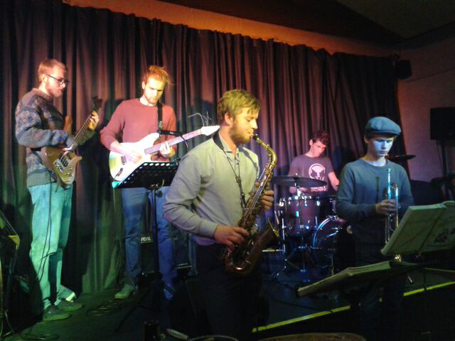 Bevor das Publikum der sehr gut besuchten Session dann wieder in den Novemberabend entlassen wurde, gaben bekannte Gesichter der "jüngeren Szene" in Celle, der Pianist Joshua Claassen, die Brüder Fréderic und Paul Tollemer an Gitarre und Bass und der Saxophonist Moritz Aring dem Nachwuchs-Drummer Erik Mrotzek die Möglichkeit, sein talentiertes, facettenreiches Spiel unter Beweis zu stellen. Unterstützt wurden sie von dem Hannoveraner Marvin Zimmermann an der Trompete.